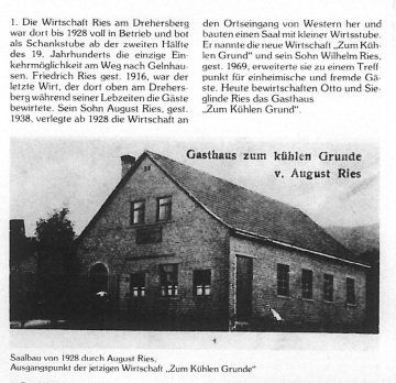 Unsere Familie betreibt das Gasthaus nun bereits in der 5. Generation. Gründer war der 1916 gestorbene Friedrich Ries, der das Gasthaus zunächst am Drehersberg betrieb. Anschließend wurde der "Kühle Grund" vom Ehepaar August und Anna Ries in der jetzigen Bayernstraße betrieben. Deren Sohn Wilhelm, und dessen Ehefrau Anna übernahmen im Jahre 1938 das Lokal. Wiederum deren Sohn Otto "Ottchen" Ries, und dessen Ehefrau Sieglinde Ries, geb. Glaab, übernahmen im Jahre 1969 das Lokal. In deren Wirkungszeit wurde der Wandel von einer herkömmlichen Dorfwirtschaft zu einem weitbekannten Speiselokal vollzogen. So wurden mehrere Umbauten und Renovierungen am Gebäude und in den Gasträumen vorgenommen, um den Anforderungen eines renommierten Speiselokals gerecht zu werden.Im Jahre 1995 übergab Otto Ries das Lokal an dessen Nachkommen Kerstin, mit Ehemann Werner, und Jürgen, die bis heute die Tradition des Hauses fortführen.